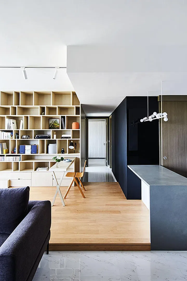 “Simple: no styles or trends” sums up the modern apartment. The home has a pared-down design, but it is inspired by a blend of ideas from the couple, says designer Kelvin Lim of Atelier Here. While the homeowner’s specifications were “neutral wood tones”, her husband envisioned their home to have a “sophisticated, chic look”.