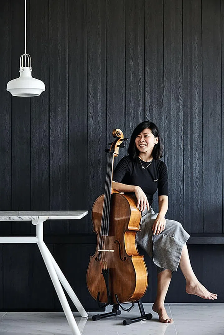 The homeowner, who plays the cello, wanted a dedicated music room and a neutral-toned theme for the home. She sits in the dining area, which features a personalised marble-top table from Somewhere&.
