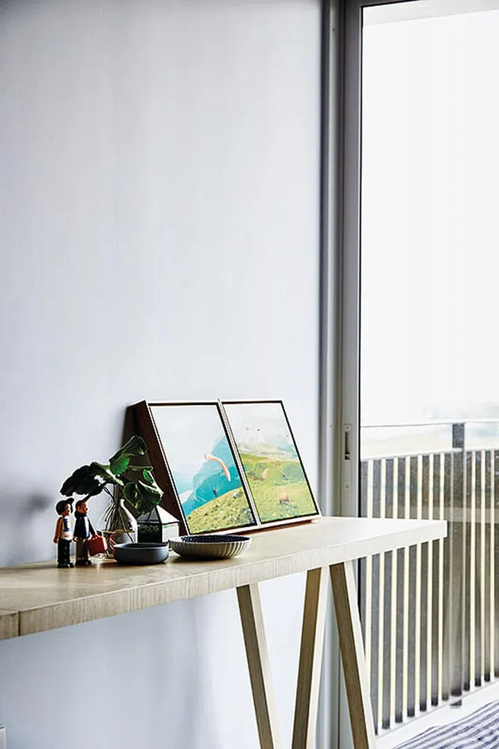 In the master bedroom, a piece of customised furniture functions as a dresser on one side, a worktop in the middle, and a sideboard for displaying decor on the other end.
