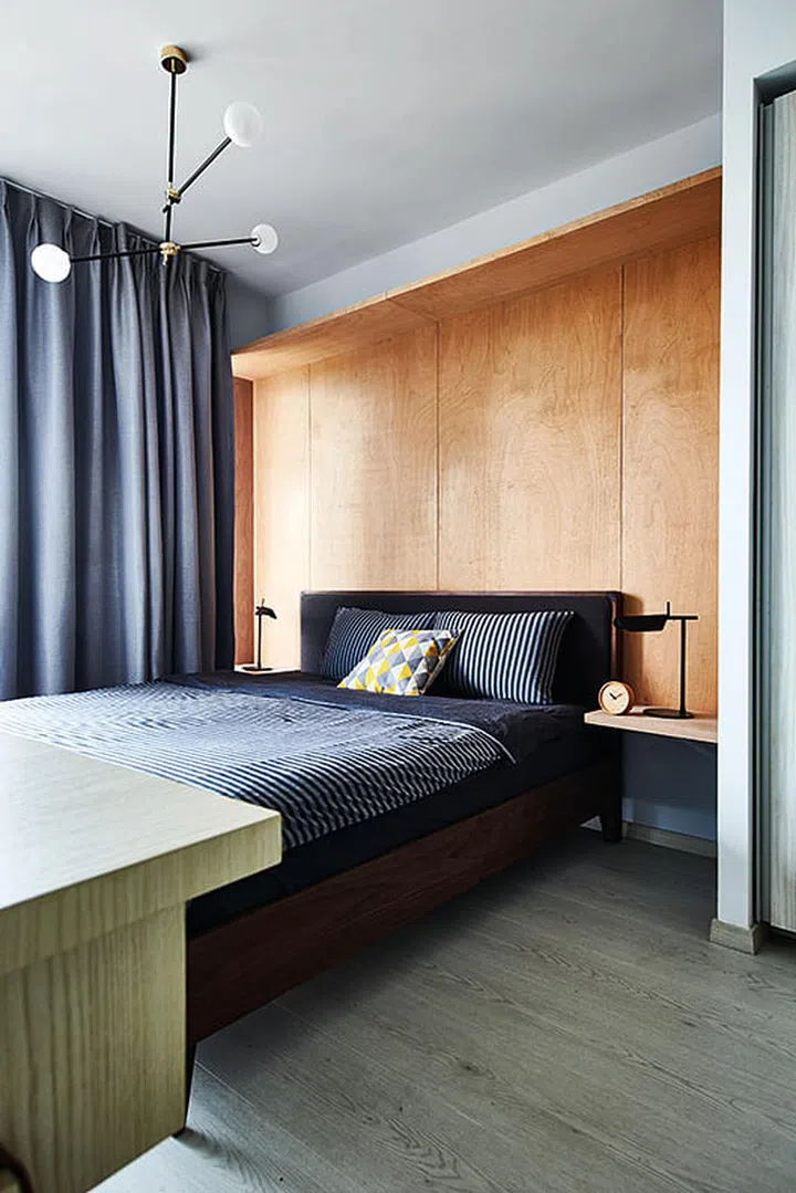 Behind the bed (from Commune), a simple feature wall was designed using raw plywood that the designer specially selected in a darker, reddish hue, to give the bedroom a warm and cosy look.