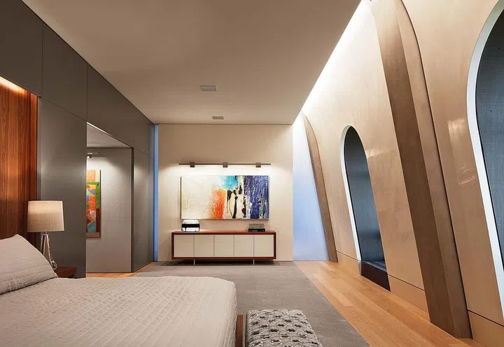 This penthouse apartment in Chicago, built within a mansard roof, is both a modern space and a nod to the heritage of the building with its uniquely curved walls.