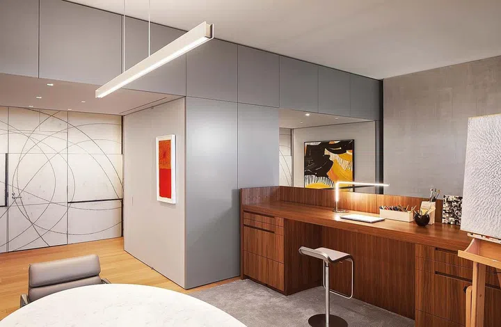 These vibrant shades are also reflected in the artwork hung throughout the apartment, calling to mind a modern art gallery. Since the sloping walls were not ideal for hanging artwork, the team focused on using as much of the remaining space possible for this purpose.