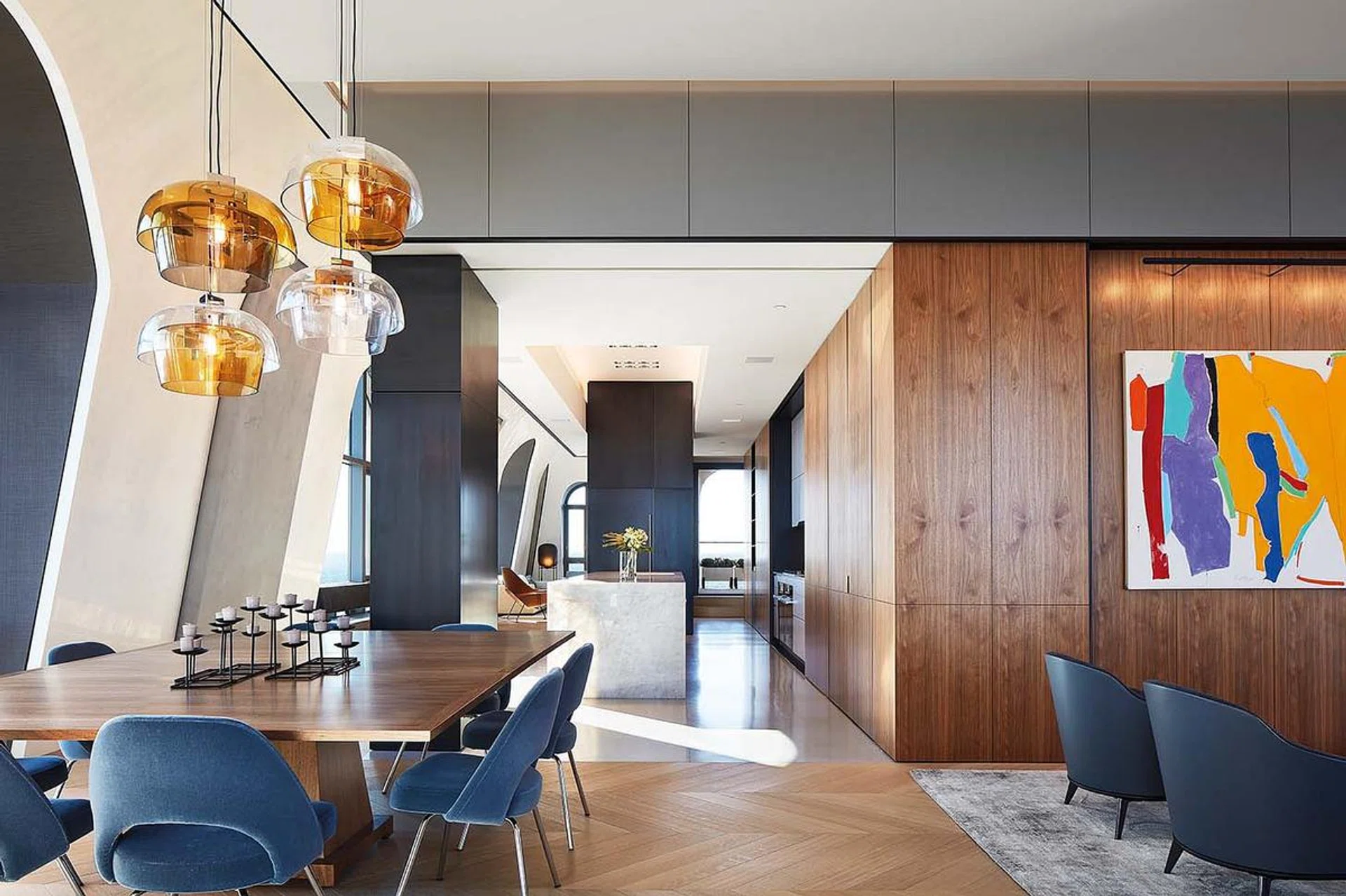 The colour scheme of the apartment, designed in collaboration with interior designer Sharlene Young, also provides a sense of harmony. The team used shades of blue and yellow in the upholstery, rugs and tiles, reflecting the colours in the dramatic views of Chicago and the lake horizon.