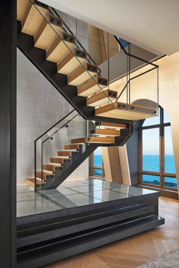 To add contrast and character, industrial elements such as dark oxidised steel were also used for key elements like the staircase. This helps to anchor the space and unify the different parts of the penthouse apartment.
