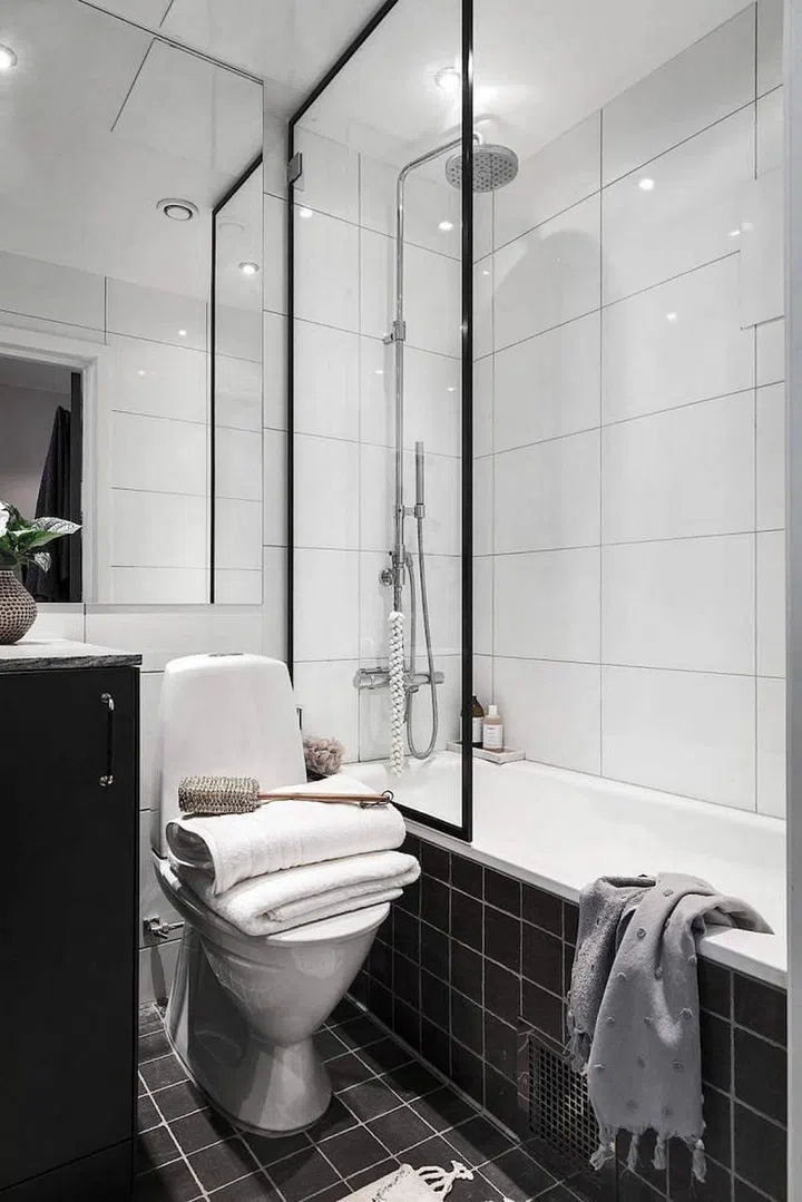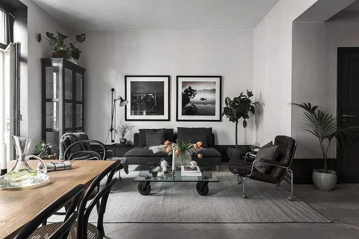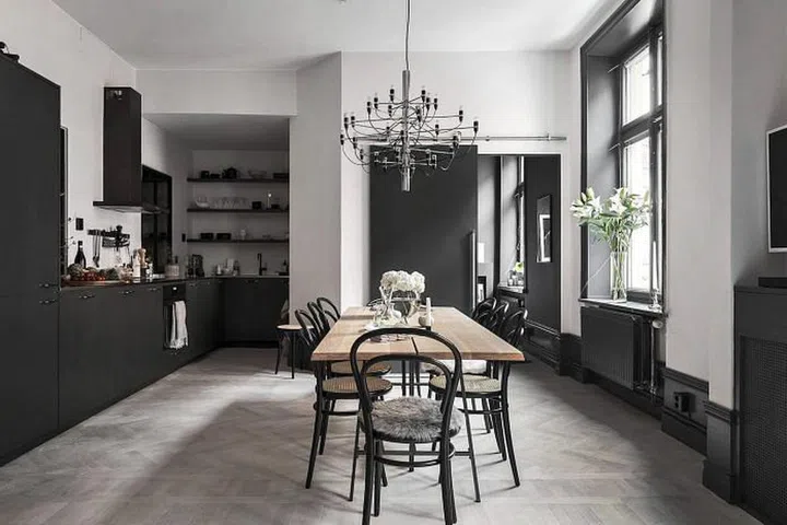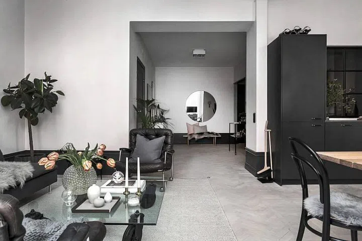 In the dining area, the contrast of black and white help to make the room look more formal and imposing. This is a great idea if you want to create a more atmospheric mood in your dining zone without cutting it off totally from the rest of the living room.