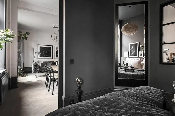 The master bedroom is decked in a dark grey tone, but because of the amount of daylight flooding the space the room looks cosy yet spacious. Notice how care was taken to hold back from letting other colours stand out in this space.