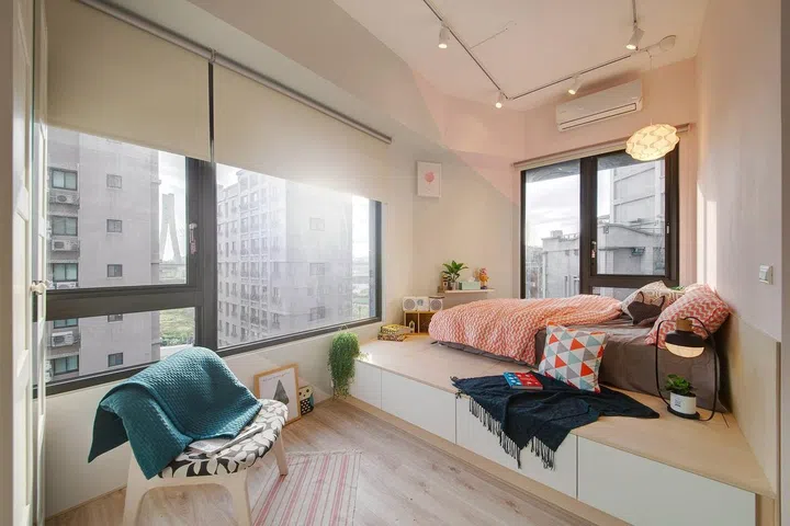 A platform bed offers more storage, while printed duvets and cushion covers add a youthful vibe to the space.