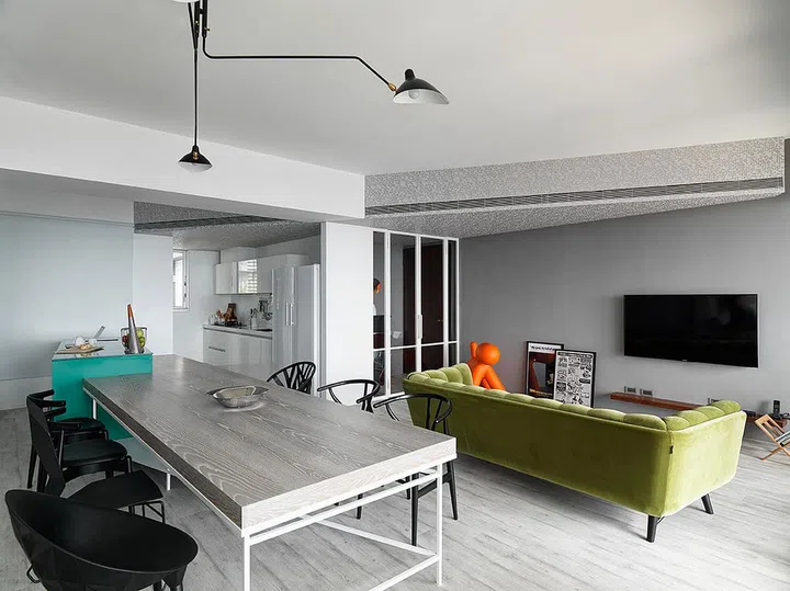 Green-hued furniture, including a tufted sofa upholstered in luxurious suede, sits in the living room. Its classical design adds a dash of eclecticism in the otherwise simple home.