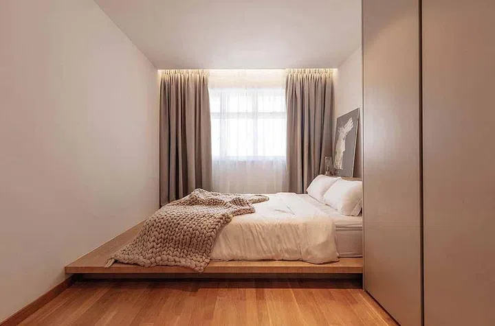 The master bedroom is a minimalist’s haven, featuring bare walls, a wardrobe and a mattress sitting on an elevated platform. Shinghui shares a design tip: “A platform bed is a good way to make the bedroom feel a little more spacious. The bed is often the largest item in the bedroom – lowering its position can help make the space feel less cluttered.”