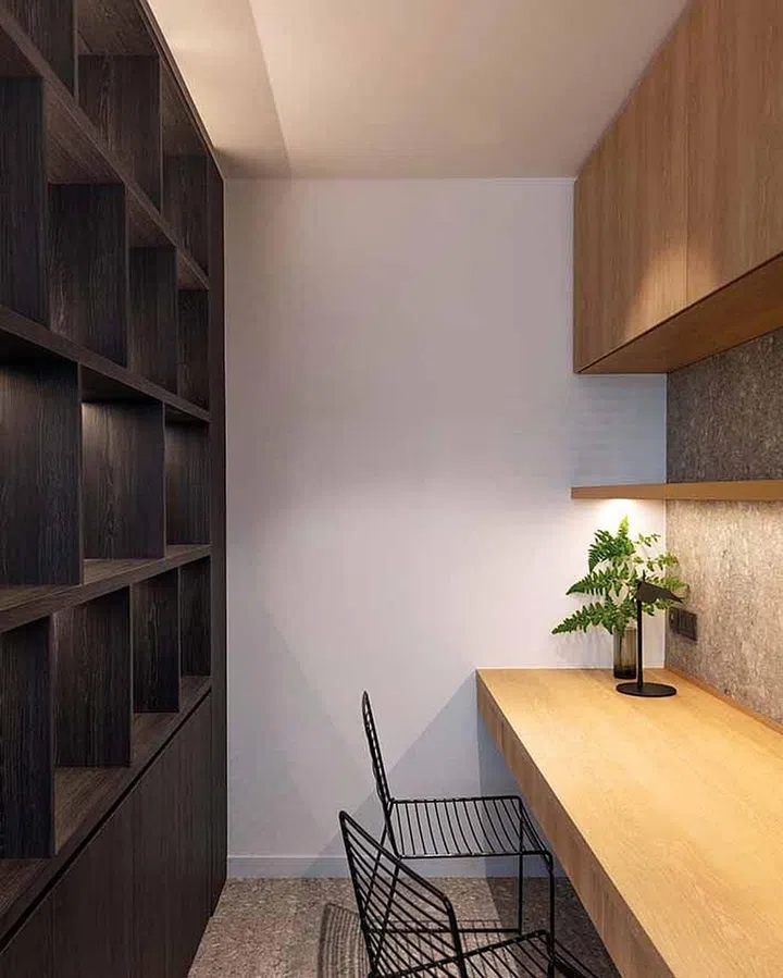 It is separated from the communal spaces by a full-height storage wall finished in charcoal timber laminate with open shelves that allow for visual connections while providing enough privacy to study and work.