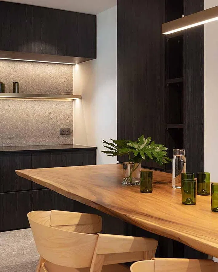 This oversize dining table from Timber Capitol is the centrepiece of the communal area. Its organic edge creates visual interest in the otherwise straight and linear aesthetic of the home.