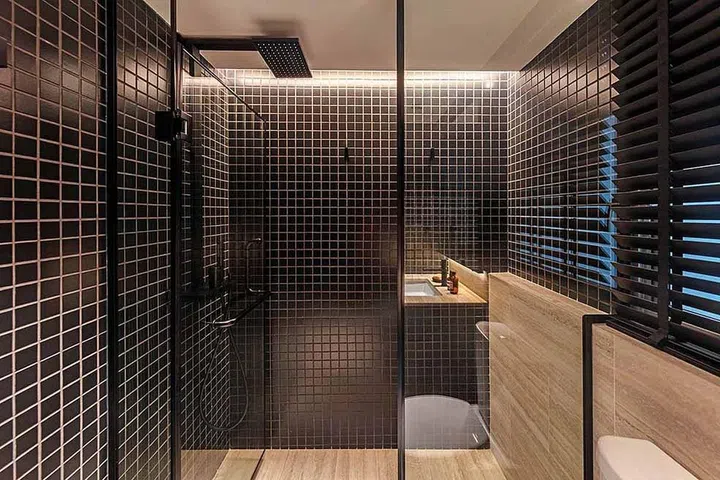 A slew of clever details rounds off the interior design, concealing the standard HDB-issued utilitarian elements. A sliding mirror fitted over one of the bathrooms’ window conceals the old school glass louvres.