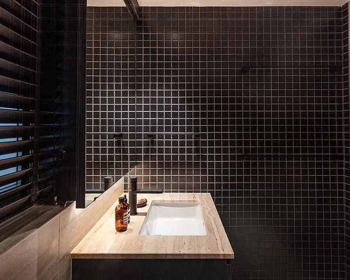 Meanwhile, the black and khaki mosaic tiles lend a cool graphic touch in the bathrooms.