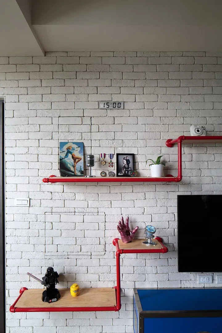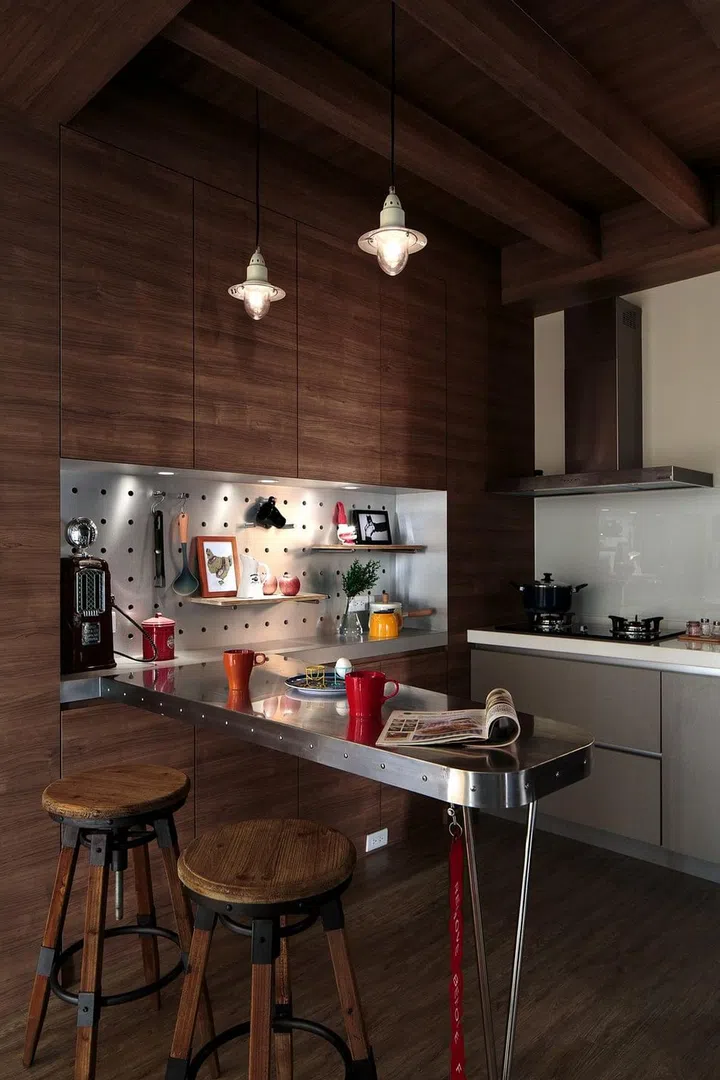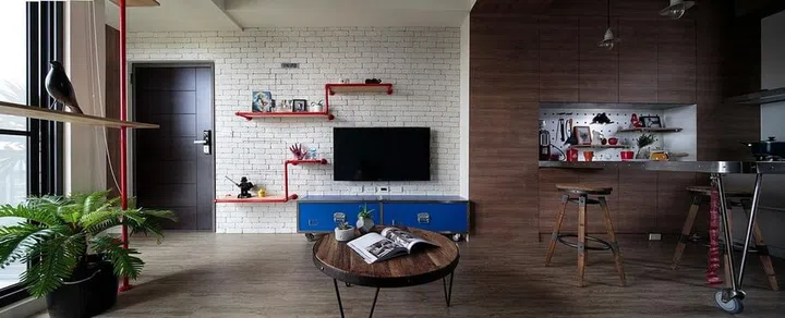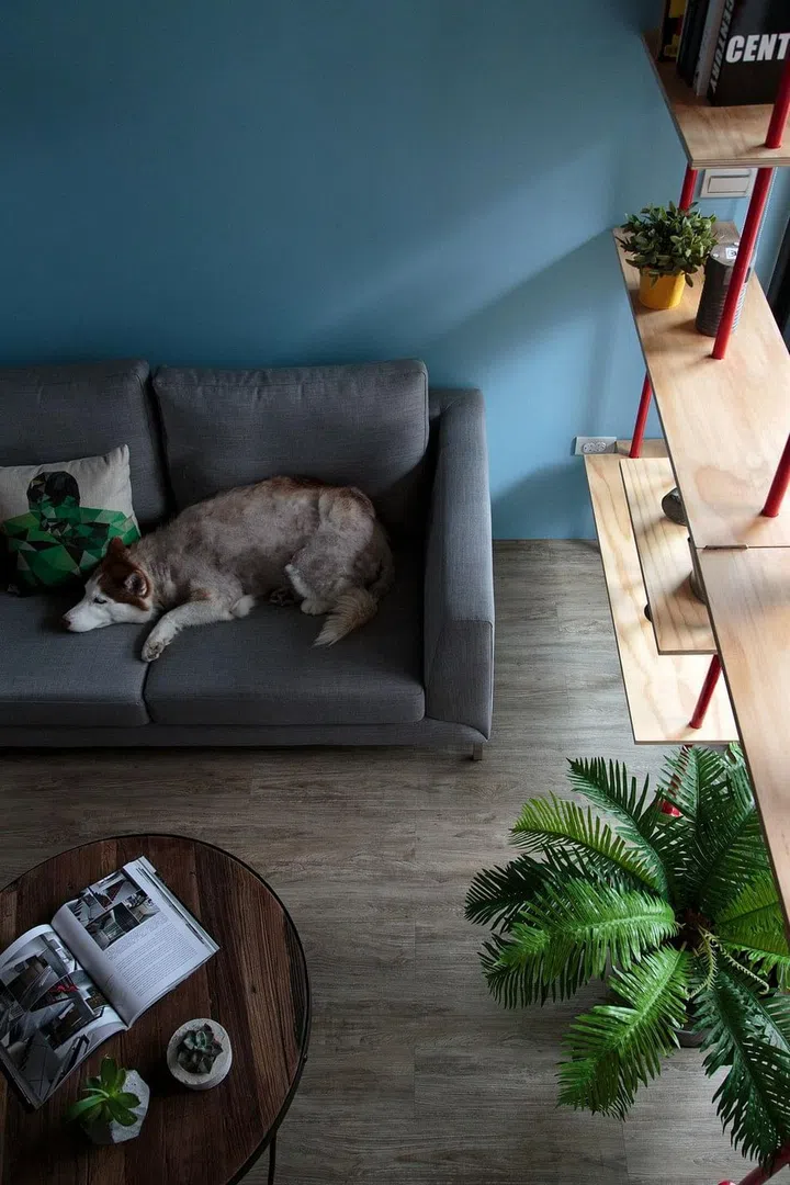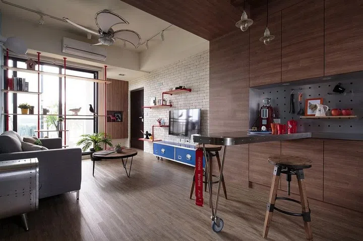 The blue walls and chirpy red accents in the living area help to inject warmth into the spaces, while the metallic trims of the cabinets and table suggest of a rugged industrial chic.