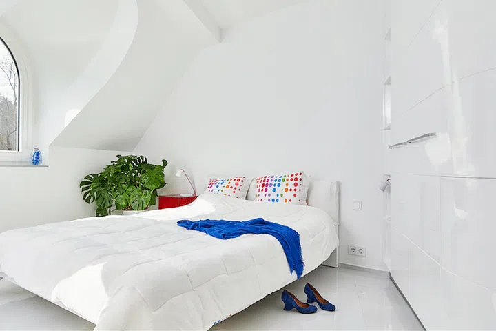 Inside a vivid colour palette, curved furniture and playful accessories pop up against white walls and minimalist lines.