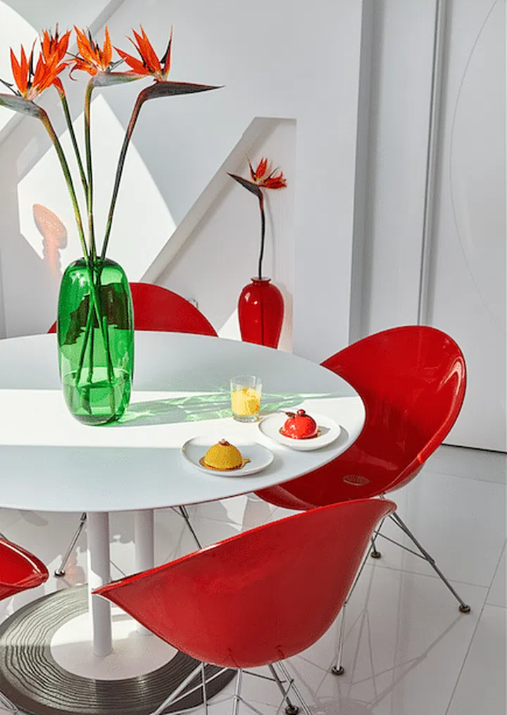 The dining room hosts a Leolux table, surrounded by Kartell chairs shaped like the petals of a flower.
