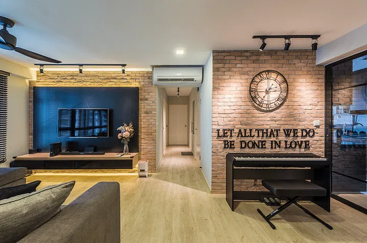 Faux brick wall designs are incorporated next to the kitchen and behind the TV console, creating striking feature walls that take centrestage in the home.