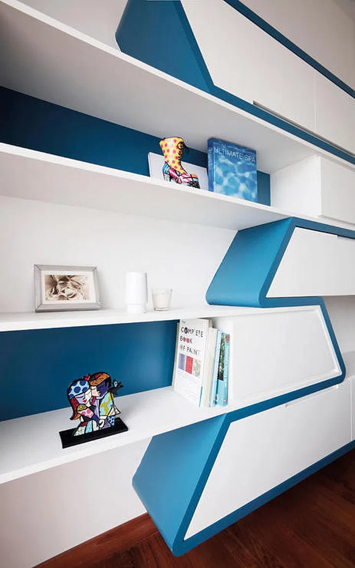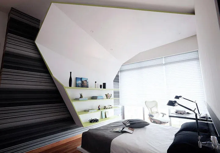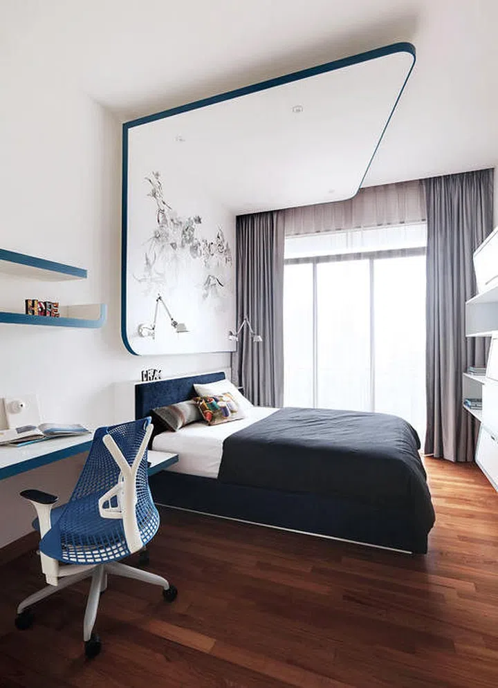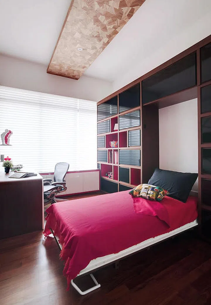 Mounted on a wall-to-ceiling feature panel, the bookshelf in the son's room look almost like an art piece. Double-layered blinds with an extra blackout layer allow him to block out the sun completely.