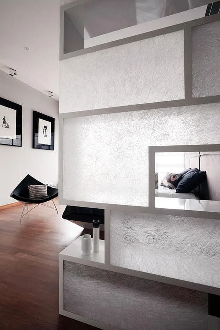 In the living and dining area, this takes the form of its focal point: Floor-to-ceiling feature panels in the shape of a large "X", which create a walkway to the kitchen and hence re-organise the area to improve spatial flow.