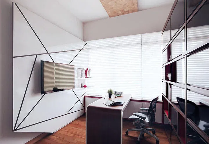 The bespoke study table, which is cantilevered over the window ledge, moves along its length. A cutout at one corner of the TV feature wall gives it an asymmetrical look.