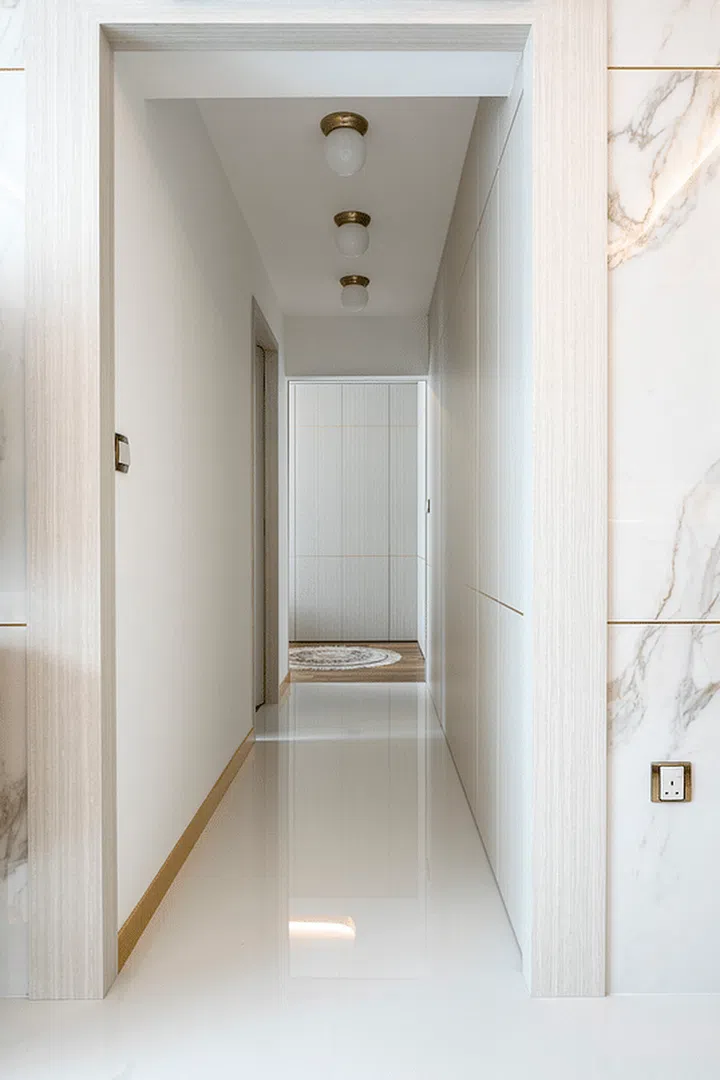 Panelling runs the length of the corridor on the right, concealing the bomb shelter and both bathrooms. This was done in part to adhere to feng shui principles, and also to create a sense of unbroken expansiveness. The couple also paid painstaking attention to detail -- here, gold winks from the light fixtures and switches, standing out against the white of the walls.