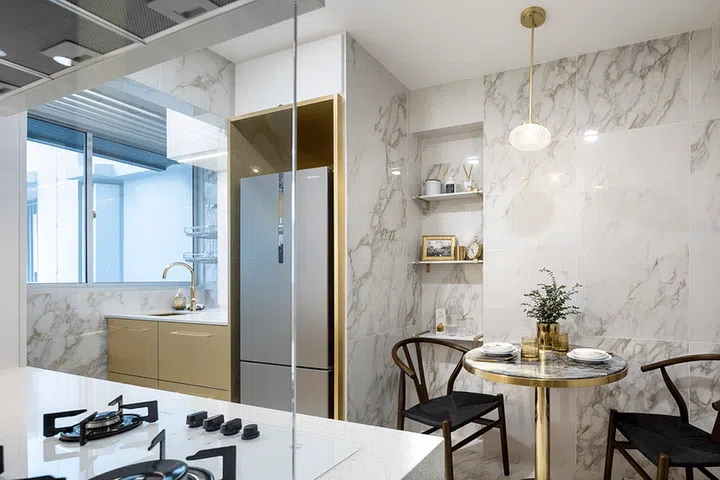 When homeowners Eugene Lee and Vernus Lou decided to take on the project of designing their three-room BTO flat, having a home with good feng shui was their priority. “We were advised to use plenty of white and gold throughout the house,” says Eugene, founder of Shijin Design Consultancy. The couple decided to do this by cladding the kitchen and part of the living room in white marble, while adding gold light fixtures and accessories for a touch of understated luxury in the home. Against this backdrop, the couple's personality shines through in their choice of furniture and accessories.