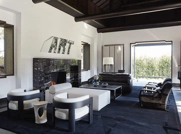 The living room fireplace and coffee table are made from the same dark marble, which visually ties in with the dark stone floors and dark stained-timber ceilings.