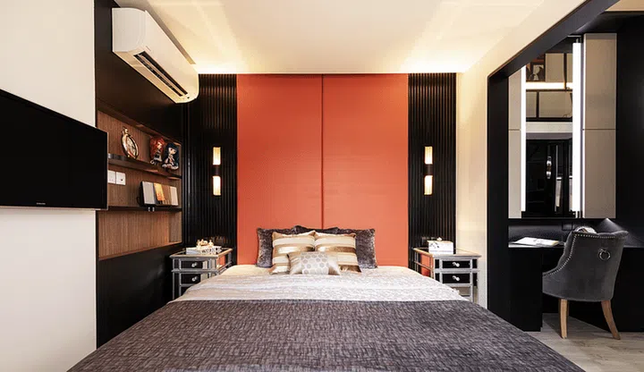 The masculine colour palette continues in the master bedroom, with dark tones and the occasional pop of colour to enliven the space. To utilise vertical space as much as possible, they opted for wall-mounted lamps and a recessed shelf for storage.