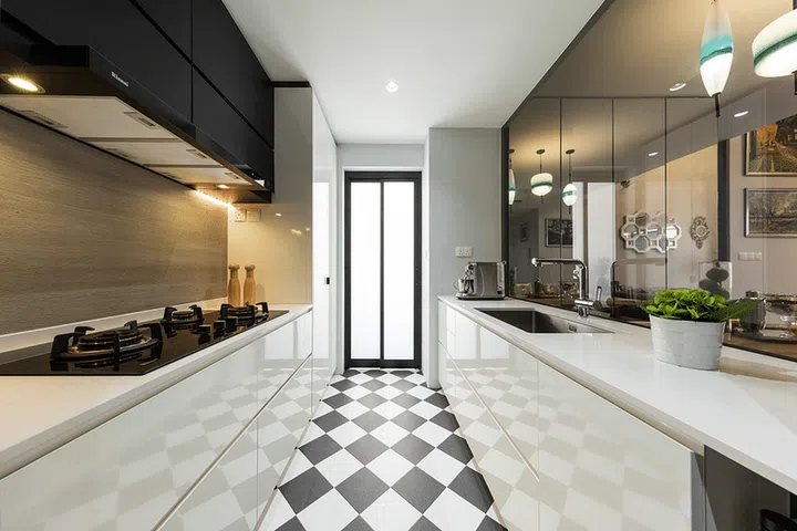 Storage was essential for Desmond’s kitchen appliances. To keep the area neat and streamlined, a monochrome colour palette was used on the cainets and flooring. Edgeline chose to keep the cabinets handle-free, ensuring a sleek overall look.