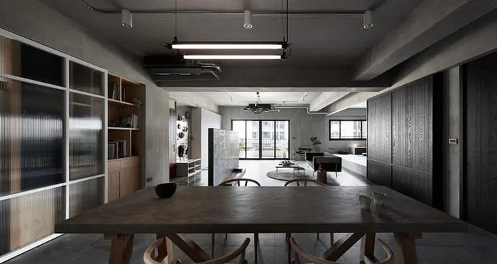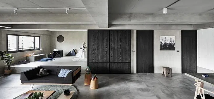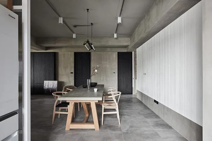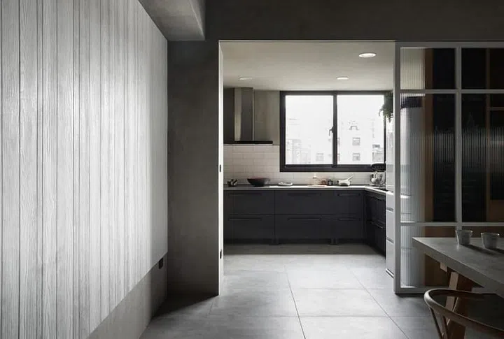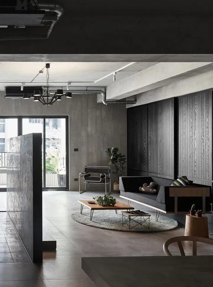 “After a series of discussions, we decided to employ a colorless gray industrial undertone, using a Lotos cement wall surface, mock-cement tiles, kiln colored patterned tiles, and steel wool stained wood veneer to create a gray and black base.”