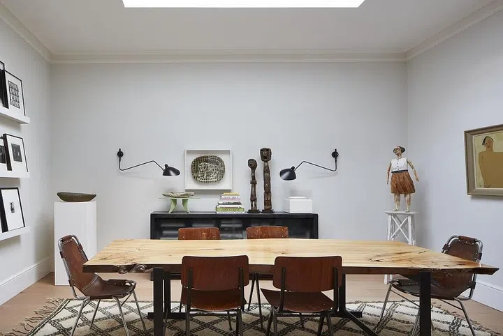 With pedestals and unique art pieces, the dining room exudes an art gallery atmosphere.
