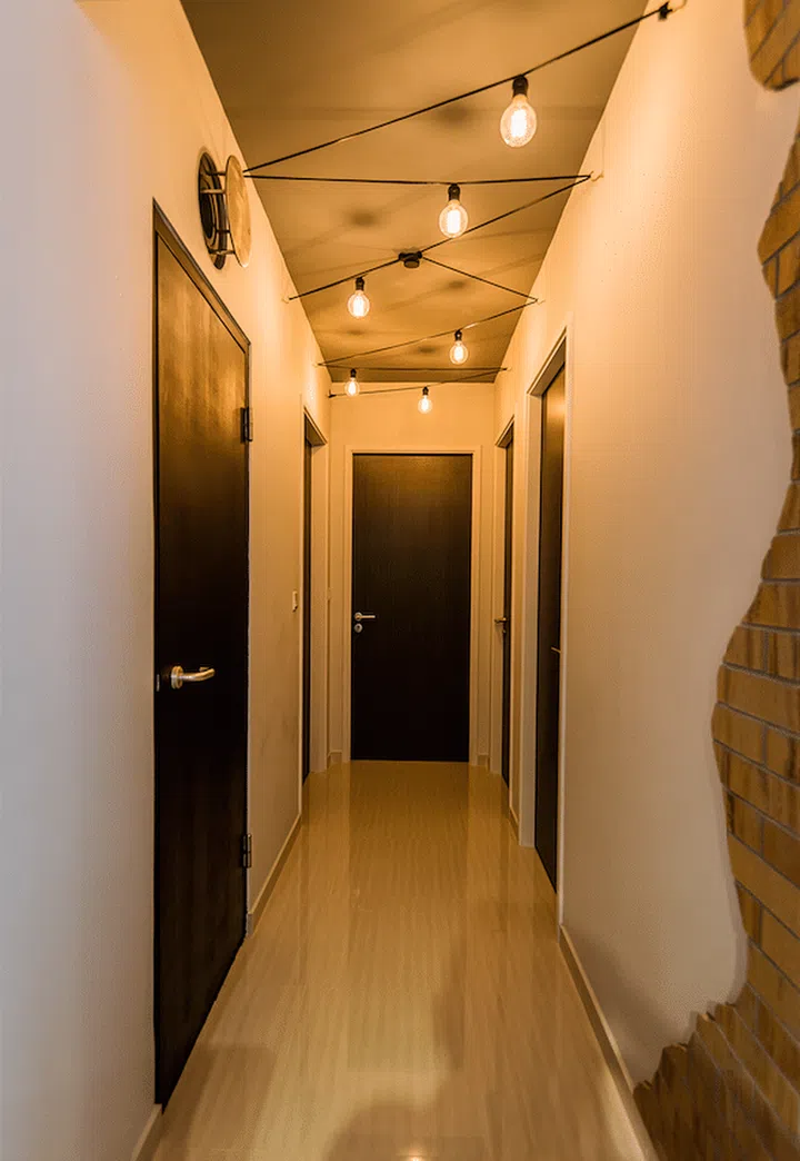 The corridor itself becomes an art installation, with a clever lighting display that proves good design doesn’t always require a hefty budget. Simple DIY elements combine to create an engaging visual experience that connects different areas of the home while maintaining the industrial-meets-retro aesthetic.