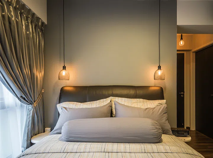 The dining area showcases the couple’s commitment to craftsmanship, featuring a bespoke movable dining table by Peng Handcrafted. Three distinctive pendant lamps hover above, their exposed bulbs casting a warm glow that makes every meal feel like a special occasion. This thoughtful lighting arrangement transforms the corridor-adjacent space into an intimate dining nook that proves small spaces in HDB DBSS apartments can be both functional and sophisticated.