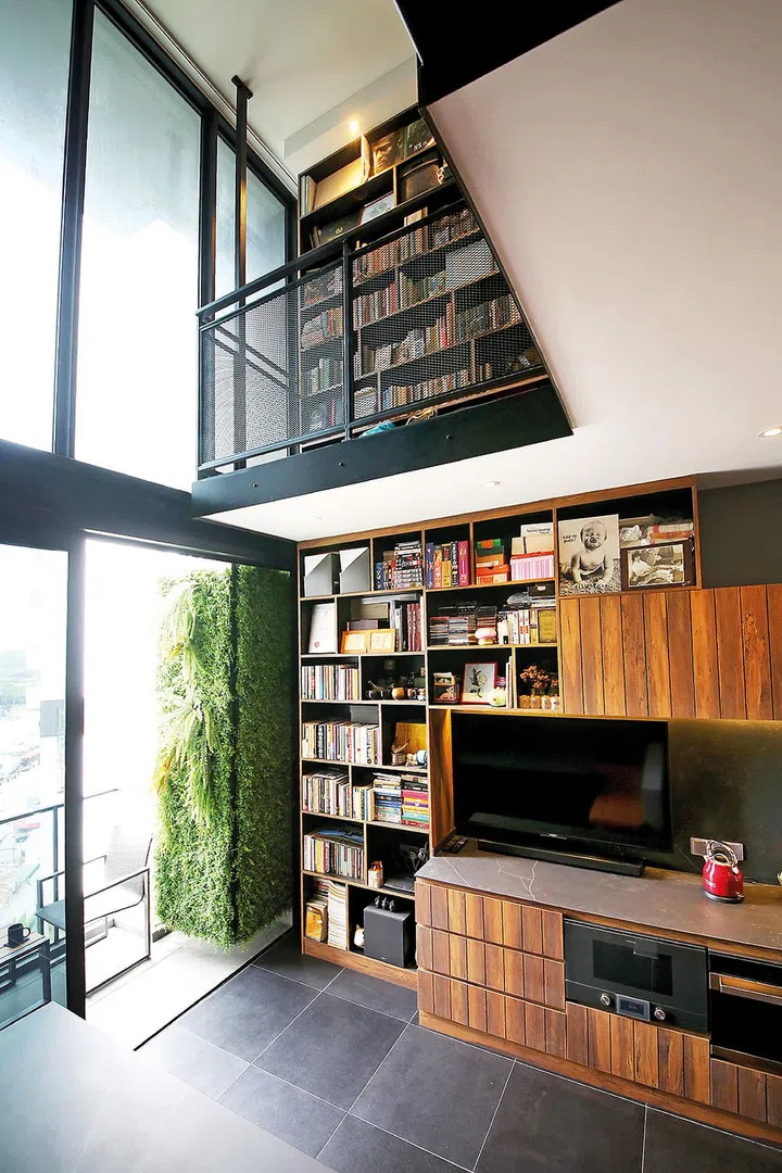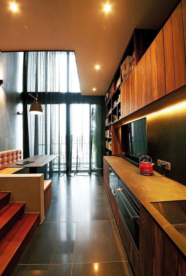 Kelvin built a loft to accommodate more practical spaces, and also made sure the different sections of the home serve multiple functions. The stretch of cabinetry on the first floor starts with a shoe cabinet at the entrance foyer, extending to the kitchen counter, then all the way to floor-to-ceiling bookshelves. A 55inch TV was mounted between the cabinets to avoid having to create a separate console.
