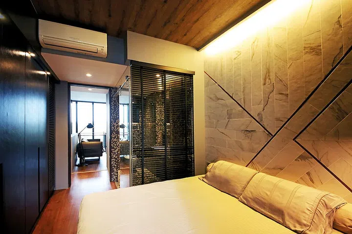 The bedroom comes with a 4m wardrobe to accommodate clothes and more storage space. The bed is elevated for a “floating” effect and to make the room feel more spacious. An artistic marble textured wall feature with copper inlay forms the backdrop to the bed, creating an ultra-luxe feel.