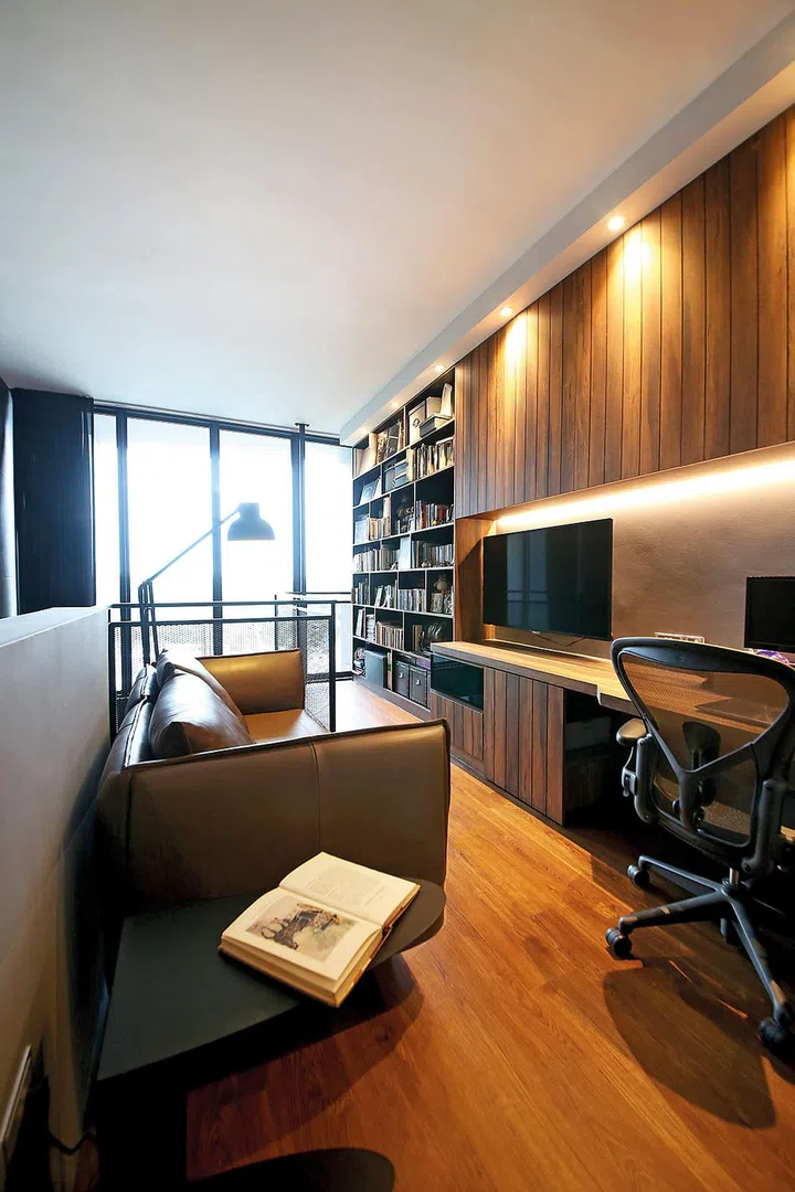 With extra space created by the extended loft, a second bookcase, identical to the one on the first floor, was designed to house more of the owner’s massive book collection. The loft functions as a study and lounging area, which comfortably fits a two-seater, with a moveable side table plus a study table for two.