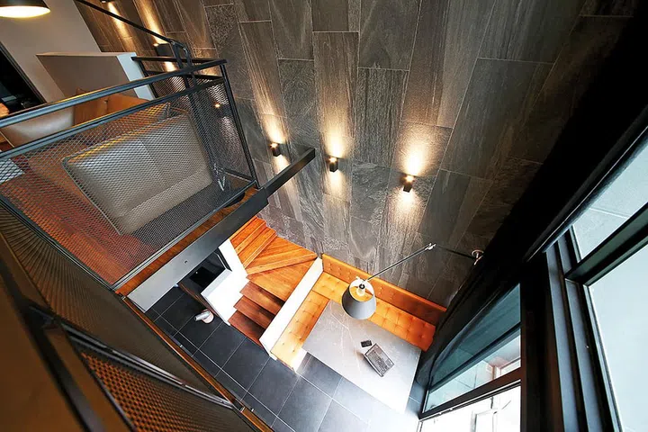 Details speak volumes in this apartment. Kelvin carefully chose the materials, from the stone-like tiles for the double volume wall to the wood-textured laminate for the carpentry (and leather laminate for the wardrobe), and black marble for the kitchen top, backsplash and dining table.