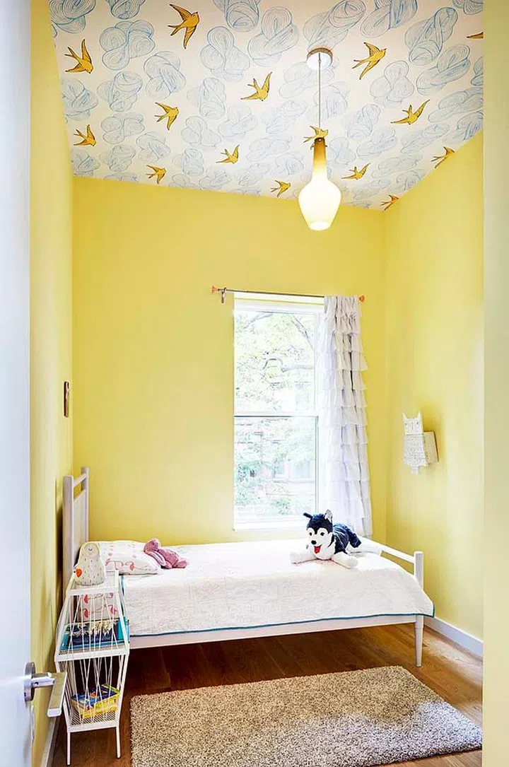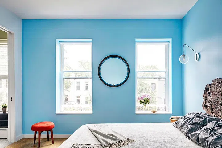 The master bedroom was simply designed, with a focus on the vibrant powder blue walls instead.