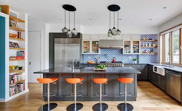 Bookshelves line the entrance to the kitchen, which was finished in a grey and blue palette. A patterned backsplash and orange bar stools create a vibrant space.