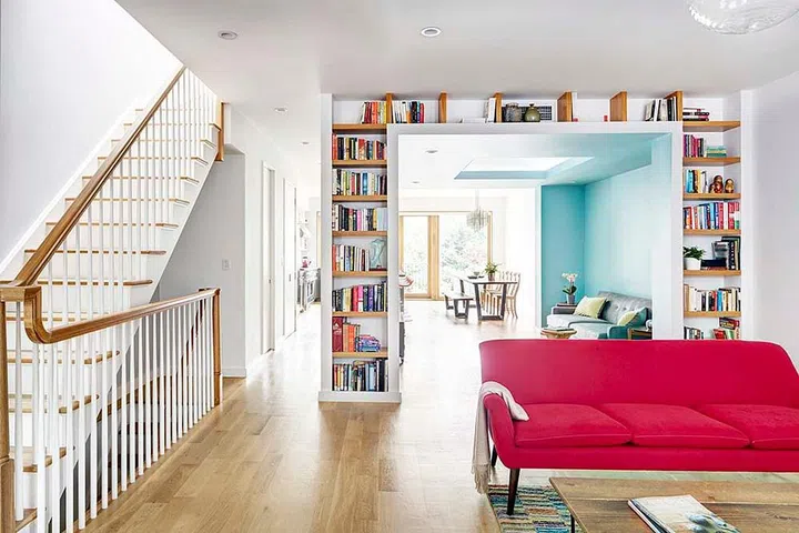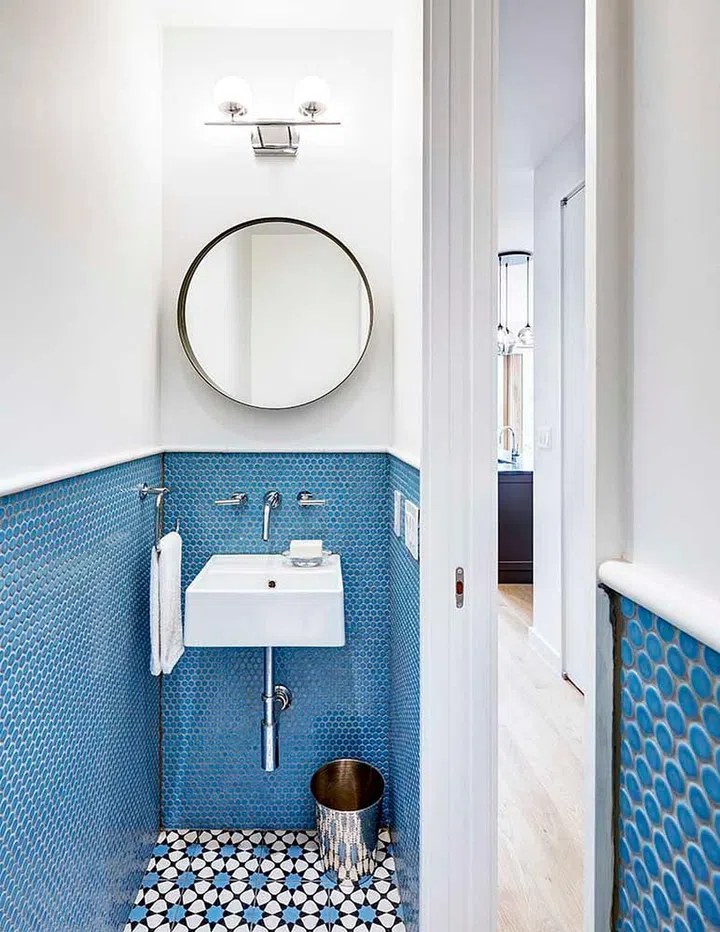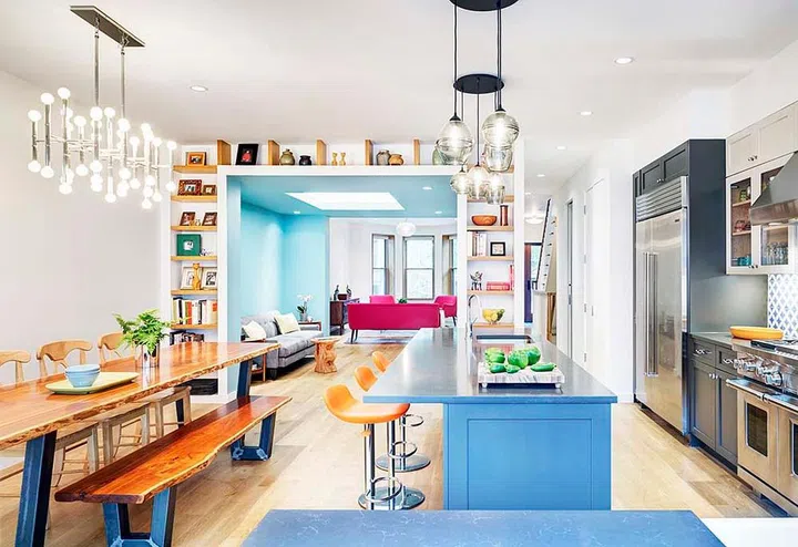 Designed by Brooklyn-based interior design firm Barker Freeman, this home gives its guests a friendly welcome with a foyer painted in a cheerful shade of blue.