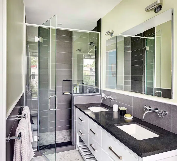 The master bathroom is clad in simple grey tiles so as not to clash with the bedroom's blue walls.