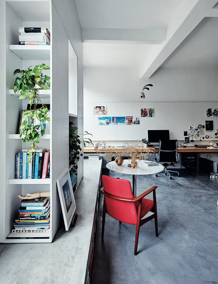 The colour scheme is predominantly grey and white, including the monochromatic Francfranc sofa and Flos lamp. The red Danish-designed discussion chair has been reupholstered numerous times, most recently in this striking hue to add a dash of colour to the home’s interiors.