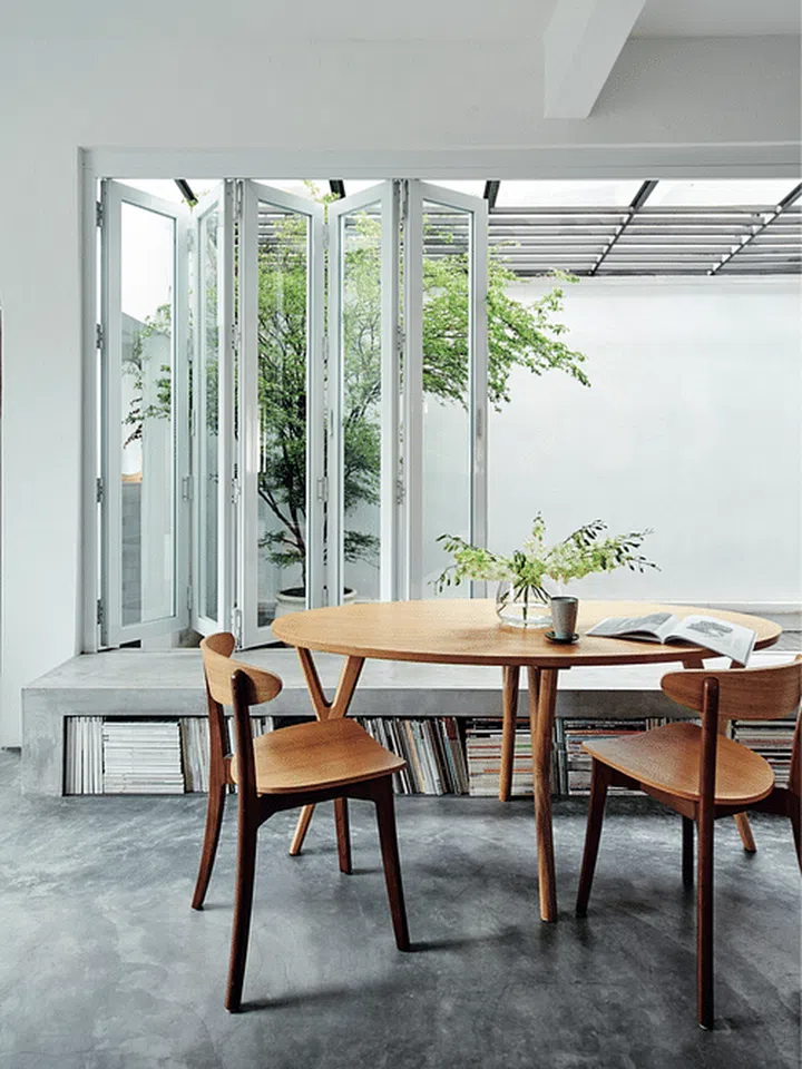 Wei Chun took pains to find this round Francfranc dining table with legs positioned such that guests can easily slide in between the concrete bench and table without the legs getting in the way.