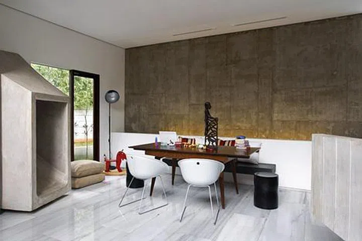 Exposed concrete was used throughout the industrial and brutalist-inspired home, along with other natural finishes to give the home a rugged and edgy look.
