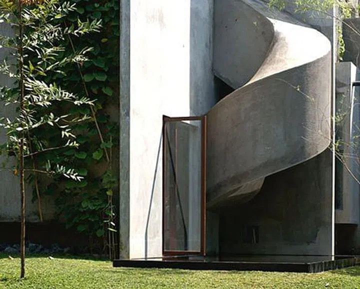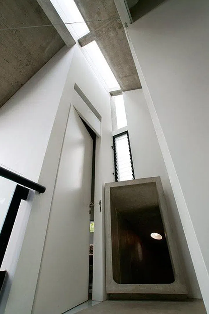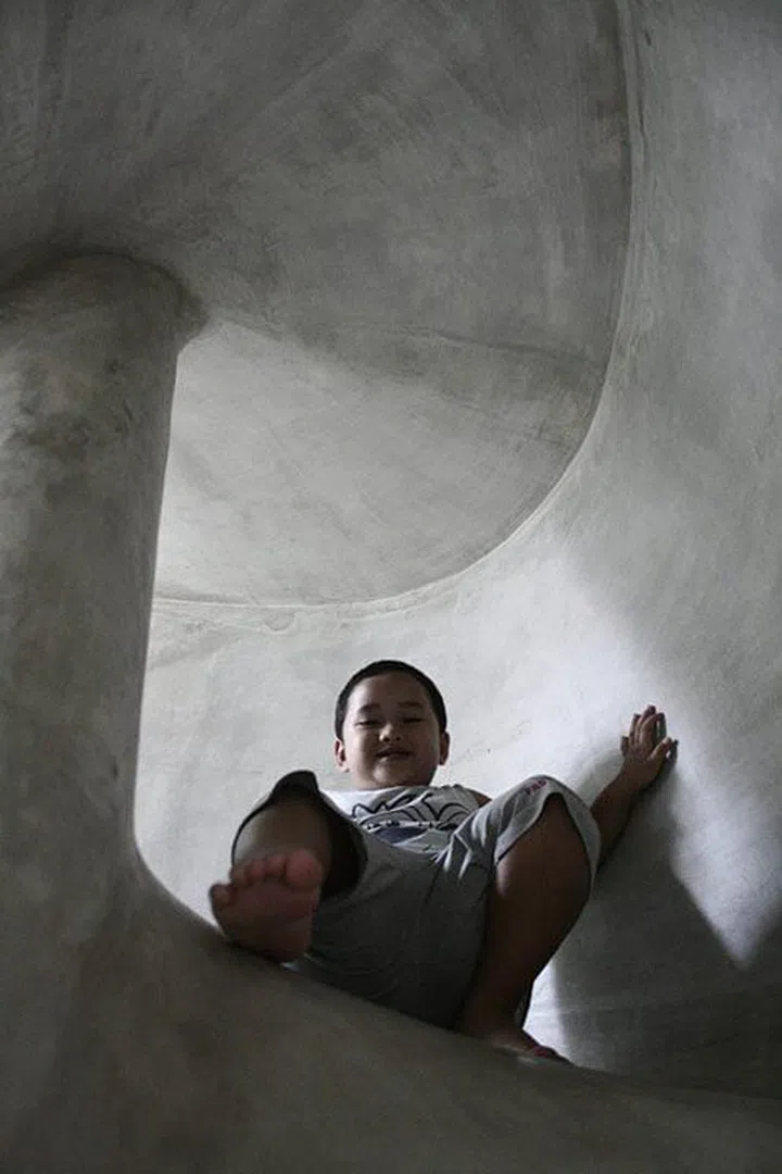One of the things the design team also did was to include a spiral concrete slide protruding out by the side facade of the landed house for the family’s (then) five-year old son.
