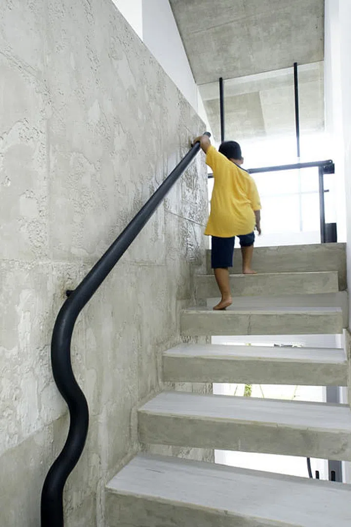 Seems like the five-year-old son is climbing up the normal staircase for another round of fun down the concrete slide.