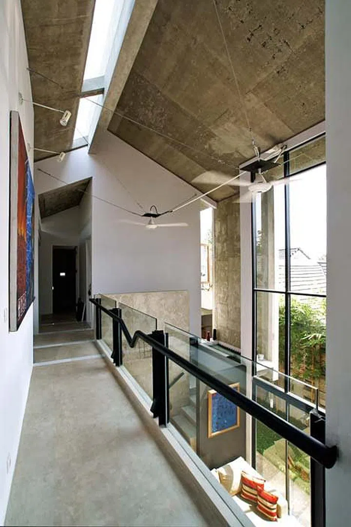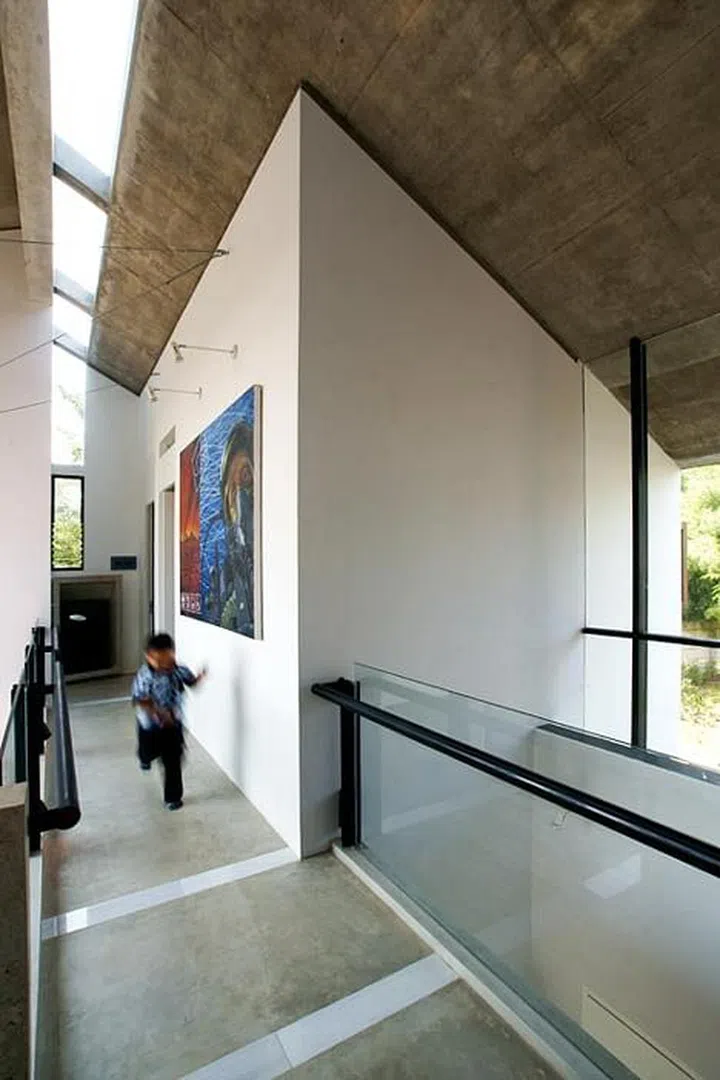 The glass parapet that runs through the second floor's bedroom corridors are embellished with stark black, pipe-like rails that are both functional for safety and aesthetically consistent with the home's industrial design.