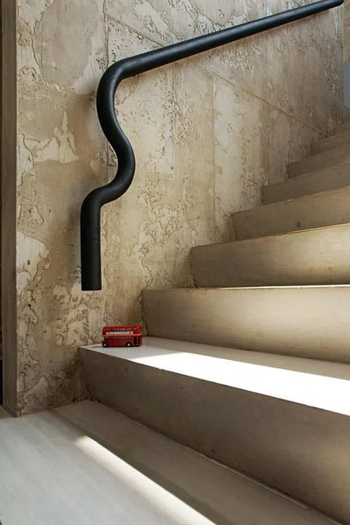 The slide leads its passengers from the second floor bedrooms directly to the ground floor's open dining area, where the family like to gather in the evenings.
