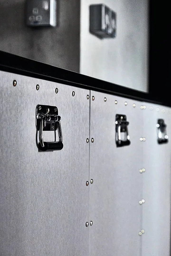 These metal latches, inspired by the flight cases used by musicians, were sourced from overseas.