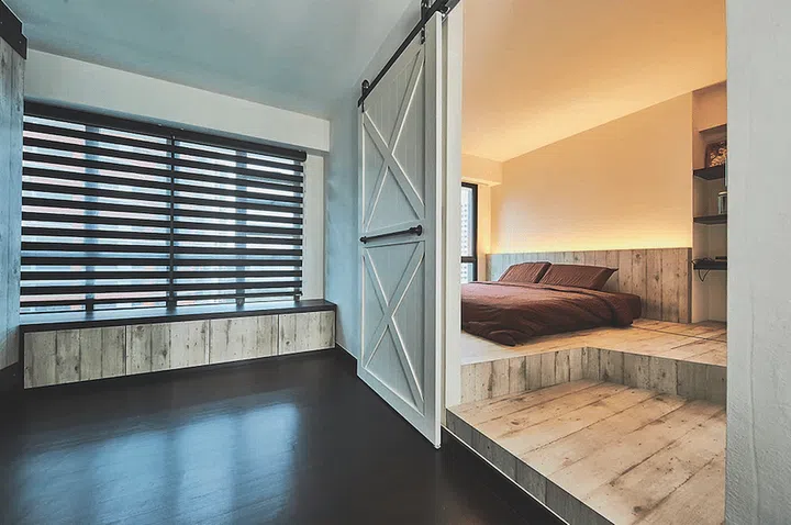 The wall between the master bedroom and adjacent bedroom was partially hacked and fitted with a barn door for extra privacy.